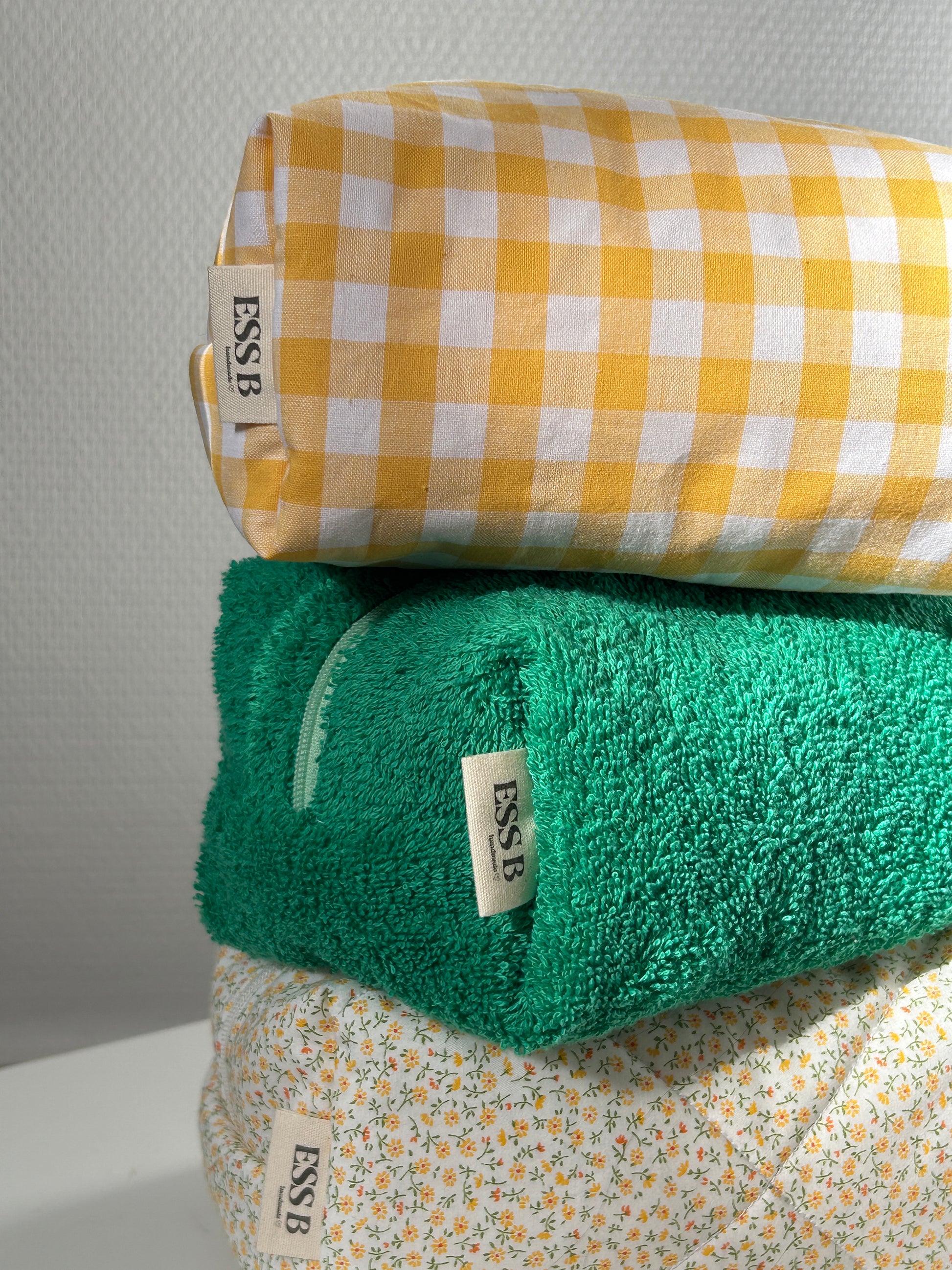 Notre trousse est doublée par un coton blanc écru. L’extérieur est en tissu éponge vert.
